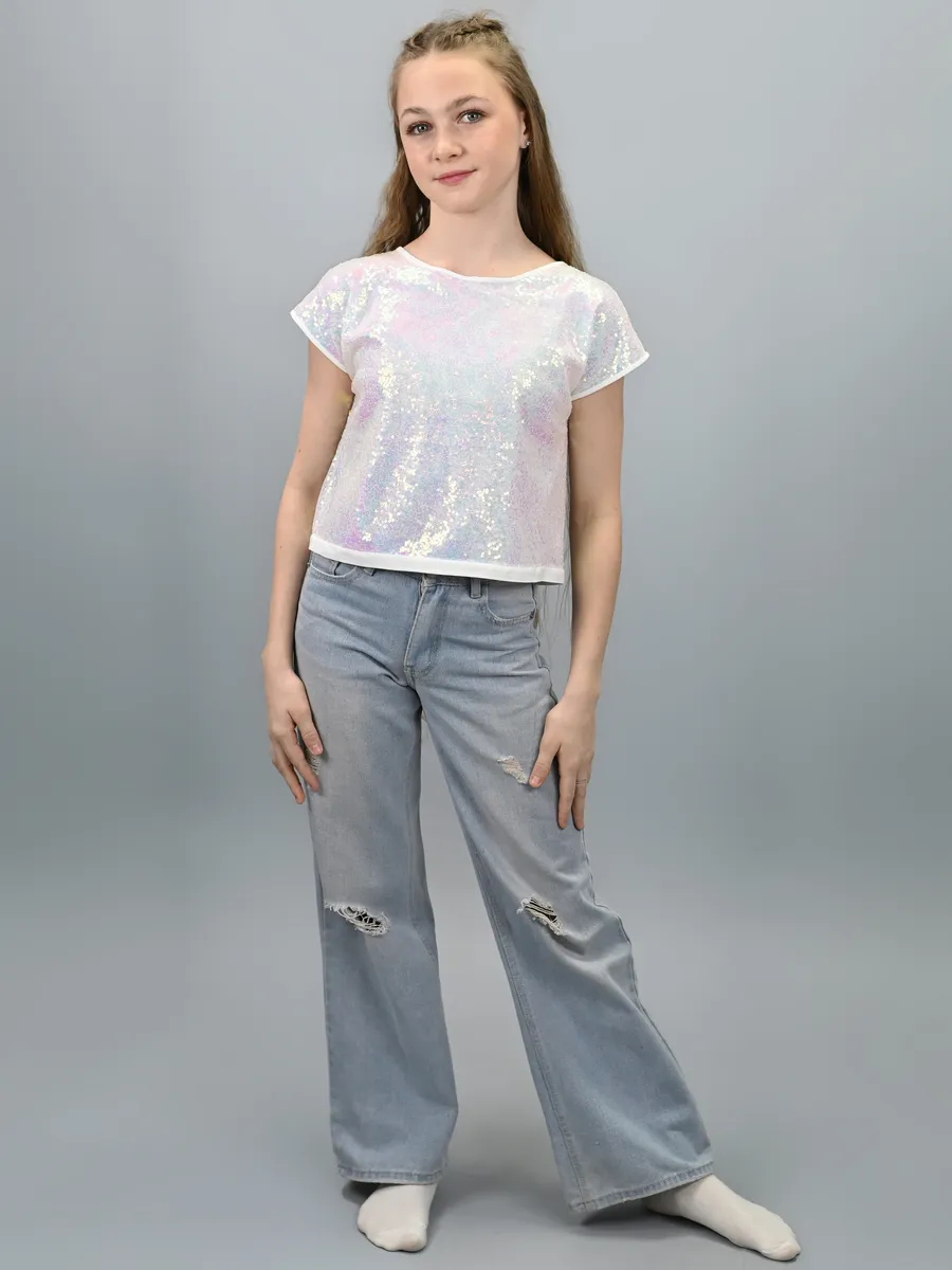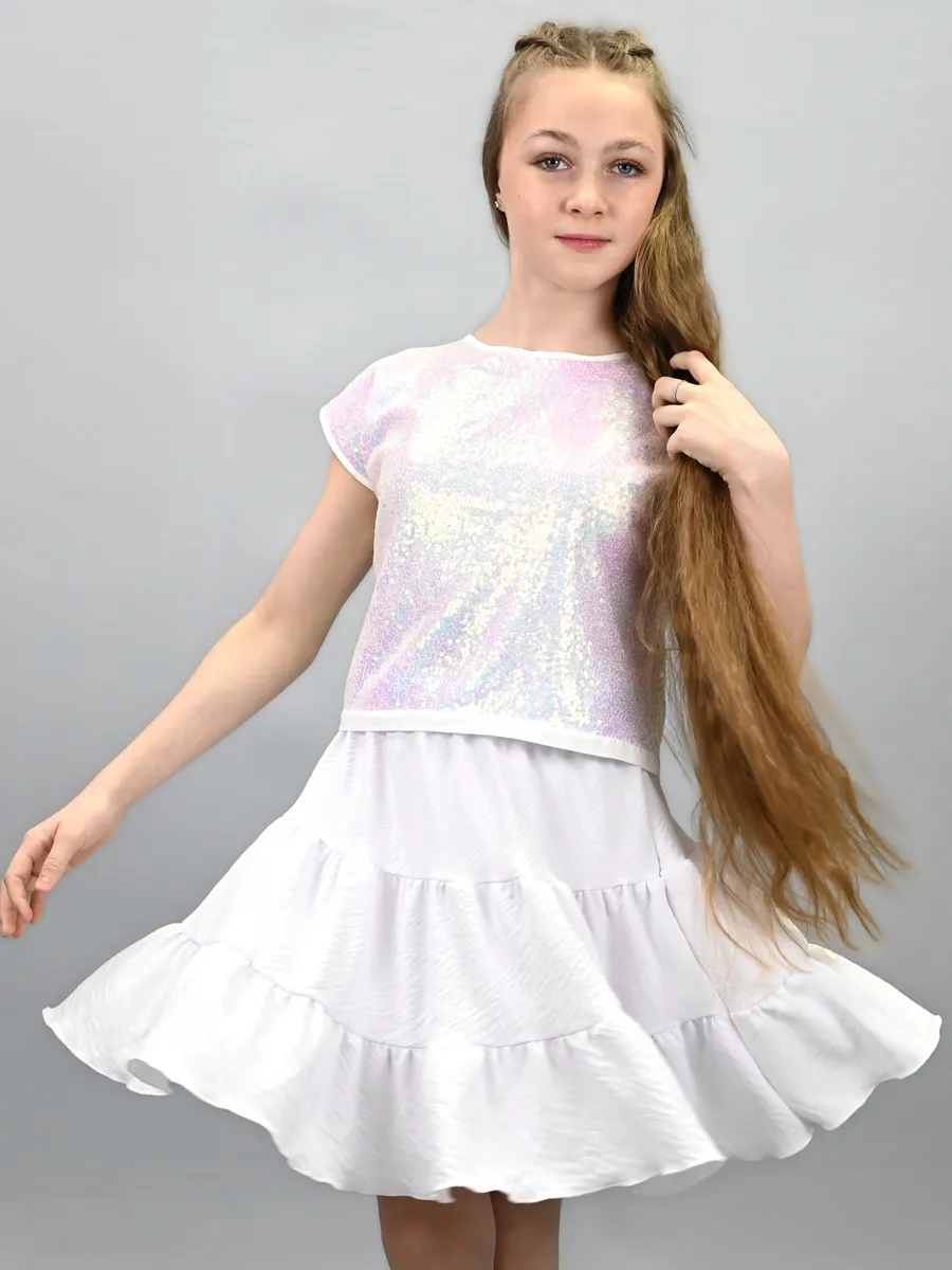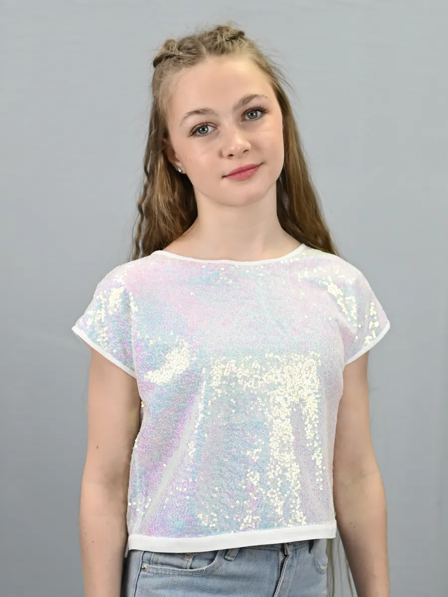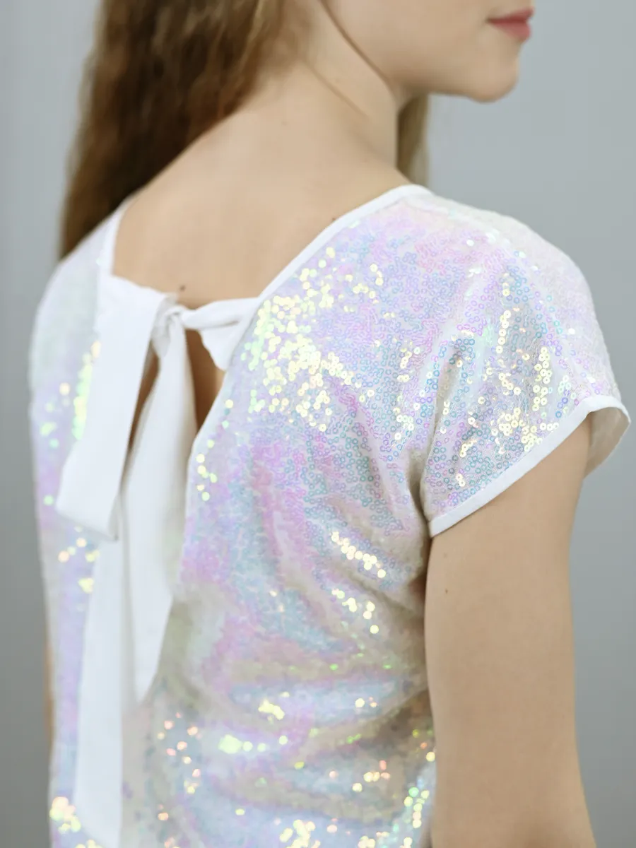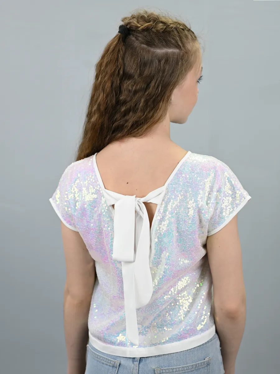 Наш кроп топ для девочек - это стильная и модная нарядная блузка свободного покроя без воротника. Предназначен он как для детей, так и для подростков. Подкладка выполнена из штапеля, в составе которого только натуральные ткани. Нарядный жемчужный топ с блестками выглядит особенно привлекательно, а открытая спина делают его великолепным выбором для особых случаев, таких как день рождения, новый год, выпускной, вечеринка. Одним из особых элементов дизайна можно считать бантик на спине, который добавляет нотку изящества и шарма. Блестящий топ идеально сочетается с любыми нарядами. Завязки на спине помогают создать эффектный вид. Модель выполнена в форме футболки с круглым вырезом и короткими рукавами. Топ праздничный выглядит стильным, красивым и привлекательным и следует последним трендам моды и стиля. Перламутровый топ так же выполнен и в других оттенках, чтобы соответствовать индивидуальным предпочтениям и вкусу каждой девочки. Благодаря своему трендовому дизайну, такая вещь станет отличным дополнением к гардеробу маленькой модницы.